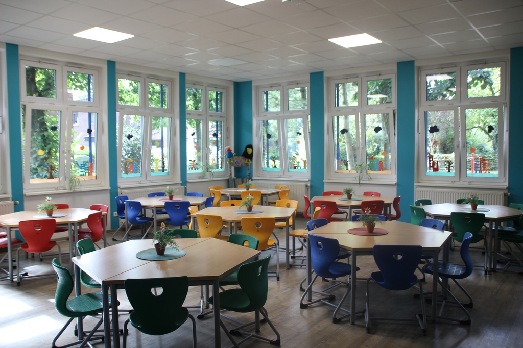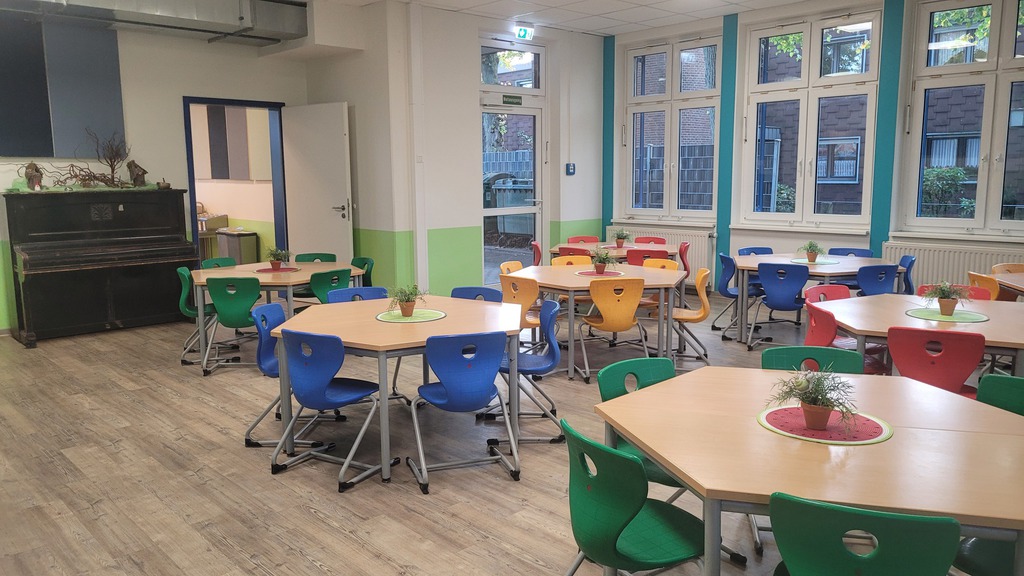 Kinder , die nicht zum warmen Mittagessen angemeldet sind, können ihr mitgebrachtes Essen auch im Speiseraum zu sich nehmen.