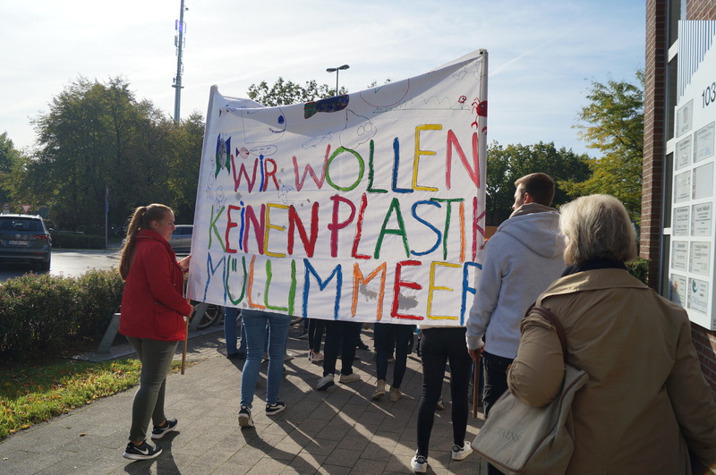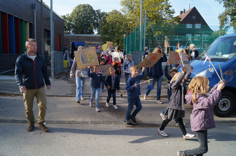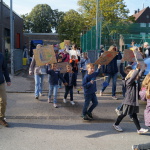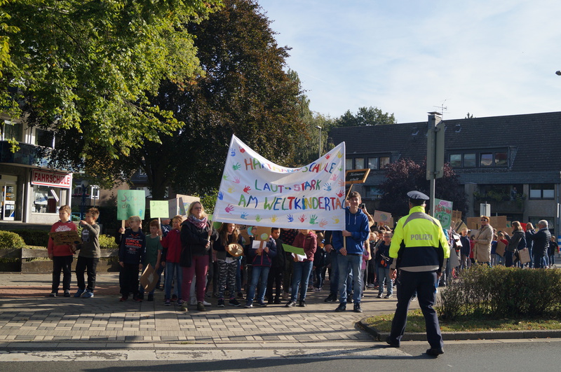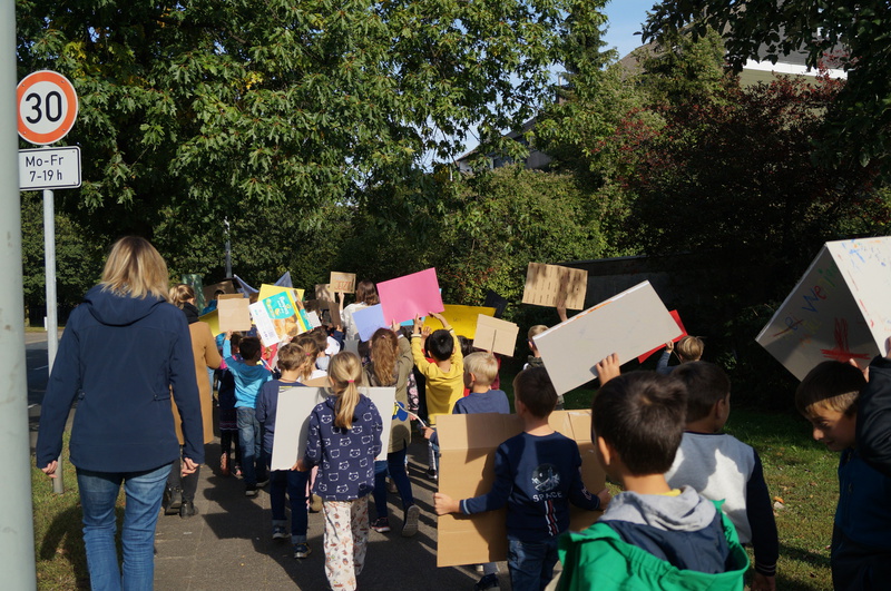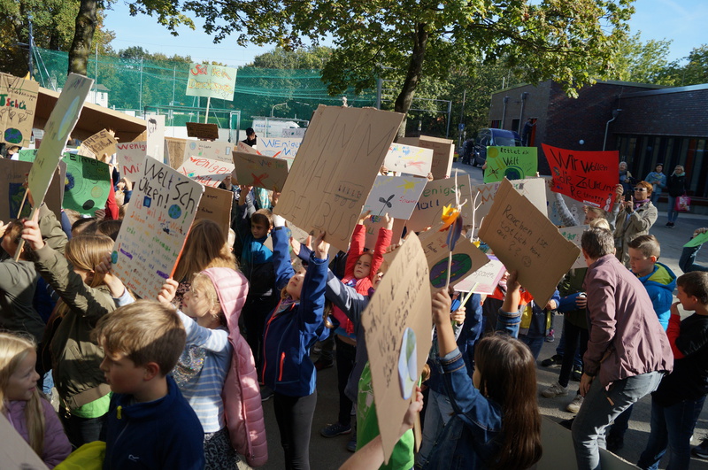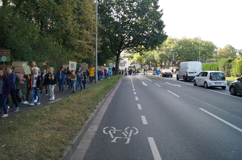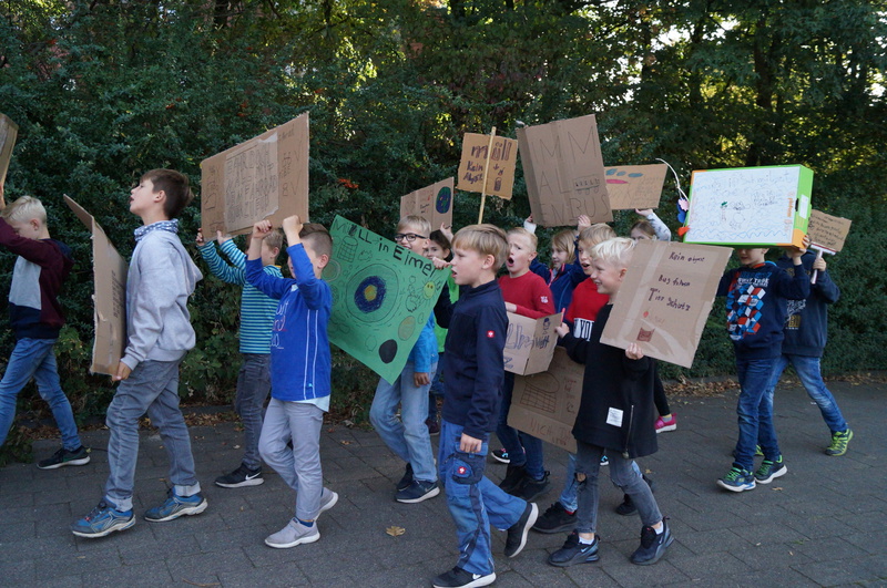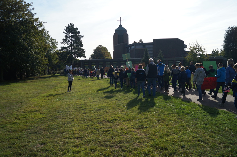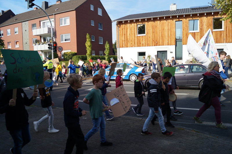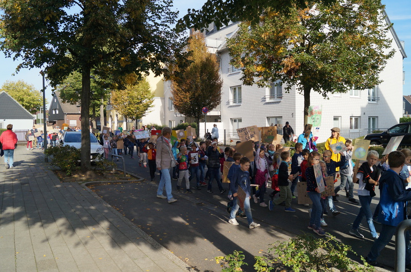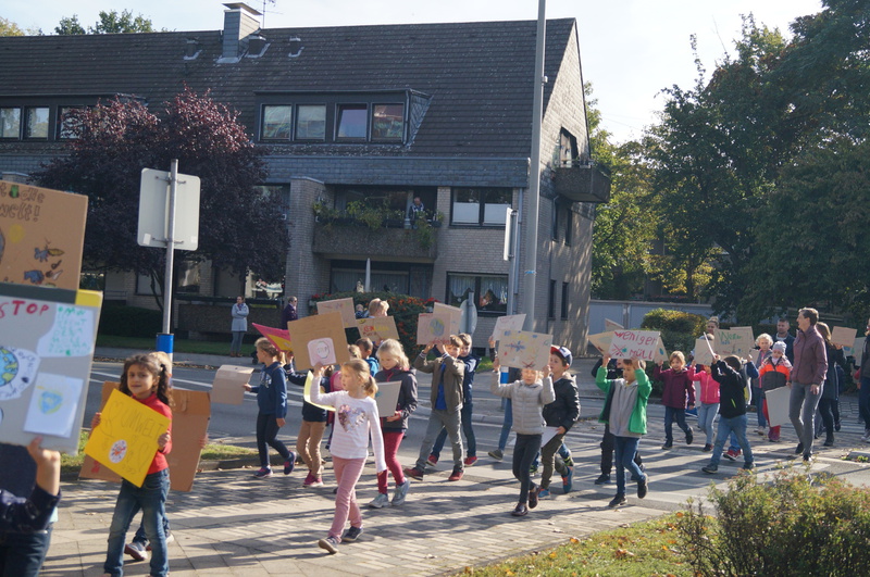 Fridays for Future vor Ort: 200 Schülerinnen und Schüler der Hartmannschule in Königshardt zogen mit ihren selbst gestalteten Plakaten durch den Stadtteil.